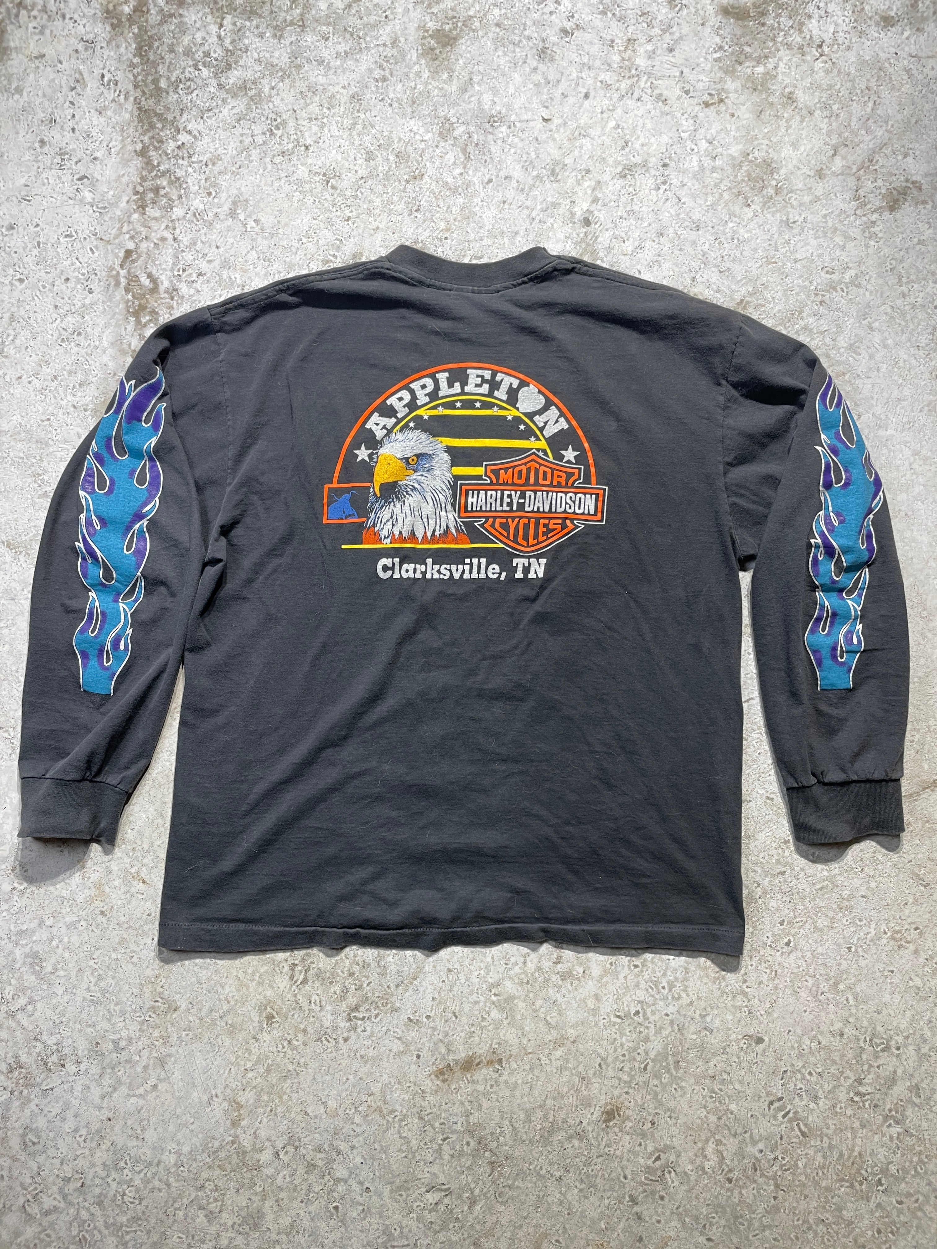 amazing long sleeve single stitch tee with a nice fade to the black cotton, Blue flames with the Blue Harley Davidson on the front and sleeves, Clarksville Tennessee dated 1993
